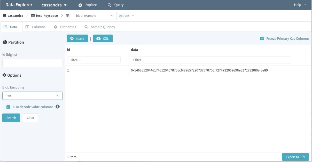 The Explore view provides a simple way to explore your data quickly. You can query by partition and clustering keys, insert and edit records, and easily export the results or download them as CQL statements.