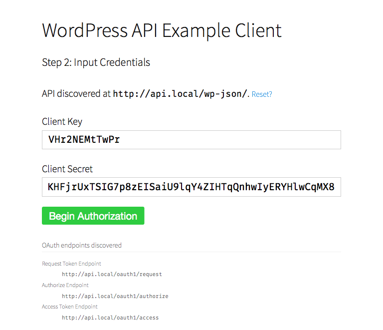 The next step is asking for your client credentials. Typically this won't be required, as your client credentials should be part of your application. (We're working on solutions to get this working across all WP sites on the internet with a single key/secret.)