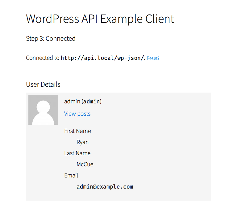Your newly gained credentials are only useful if you can use them for something! For this demo application, we display your user details, which should let you verify that we're getting the real details from the site.