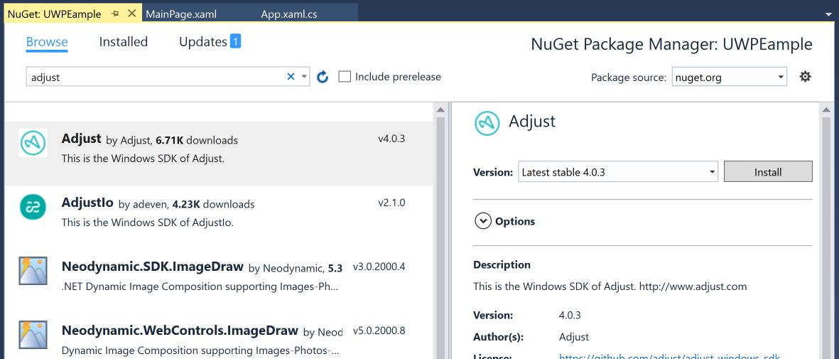 These are the basic steps required to integrate the Adjust SDK into your Windows Phone or Windows Store project. We are going to assume that you use Visual Studio 2015 or later, with the latest NuGet package manager installed. A previous version that supports Windows Phone 8.1 or Windows 8 should also work. The screenshots show the integration process for a Windows Universal app, but the procedure is very similar for both Windows Store or Phone apps. Any differences with Windows Phone 8.1 or Windows Store apps will be noted throughout the walkthrough.