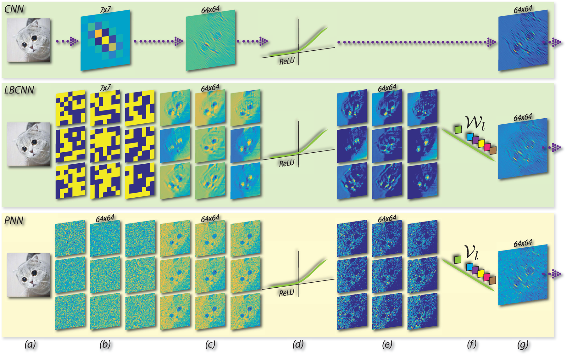 Basic modules in CNN, LBCNN, and PNN. Wl and Vl are the learnable weights for local binary convolution layer and the proposed perturbation layer respectively. For PNN: (a) input, (b) fixed non-learnable perturbation masks, (c) response maps by addition with perturbation masks, (d) ReLU, (e) activated response maps, (f) learnable linear weights for combining the activated response maps, (g) feature map.