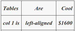 Tables | | Tables | Are | Cool | |----------|:-------------:|------:| | col 1 is| left-aligned | $1600 | | |