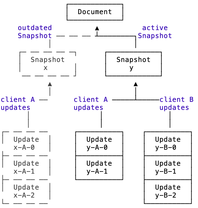 - A collaborator is added to the document. When creating a new snapshot the new collaborator only sees the current state from now on. This only works if the CRDT implementation supports tombstones e.g. Yjs Algorithm.