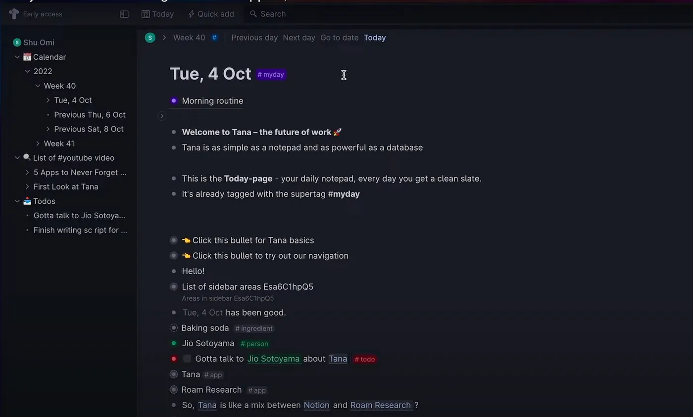 The biggest influences for Treehouse are Tana, Notion, and Obsidian. These three represent the state of the art of personal and collaborative information management, sometimes simplified as note-taking tools. However, "note-taking tools" sells them short as they go beyond note-taking and information management. For lack of a better descriptor, many consider them tools for thought.