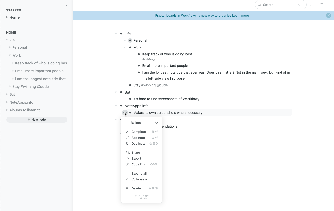 Meanwhile, a separate paradigm of note-taking tools emerged, focusing on the nested, tree-like structure of the outline. Perhaps inspired by tools like OmniOutliner and Org Mode for Emacs of the 2000s, Workflowy appeared in 2010 as a no-frills web-based outliner.