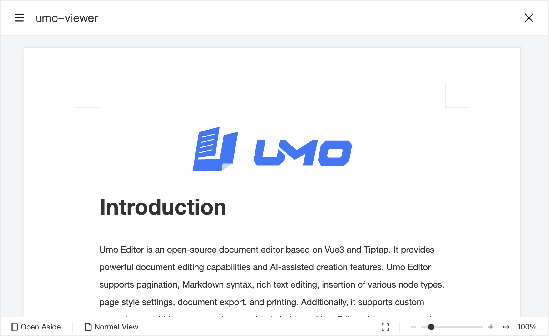 Umo Viewer is a PDF document viewer built with Vue3 and PDF.js. It supports previewing PDF documents directly in the browser and also supports previewing Umo Editor document content.
