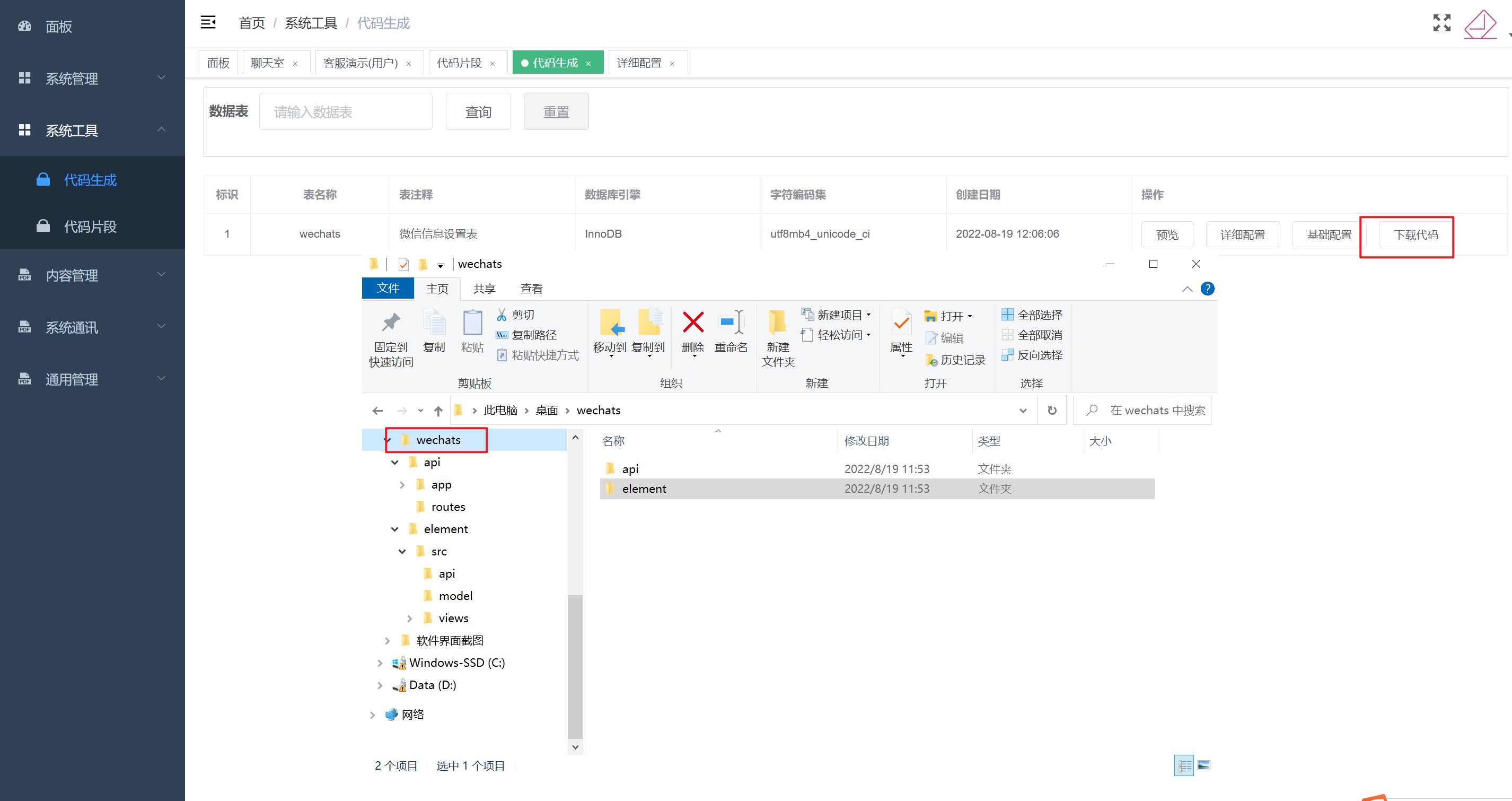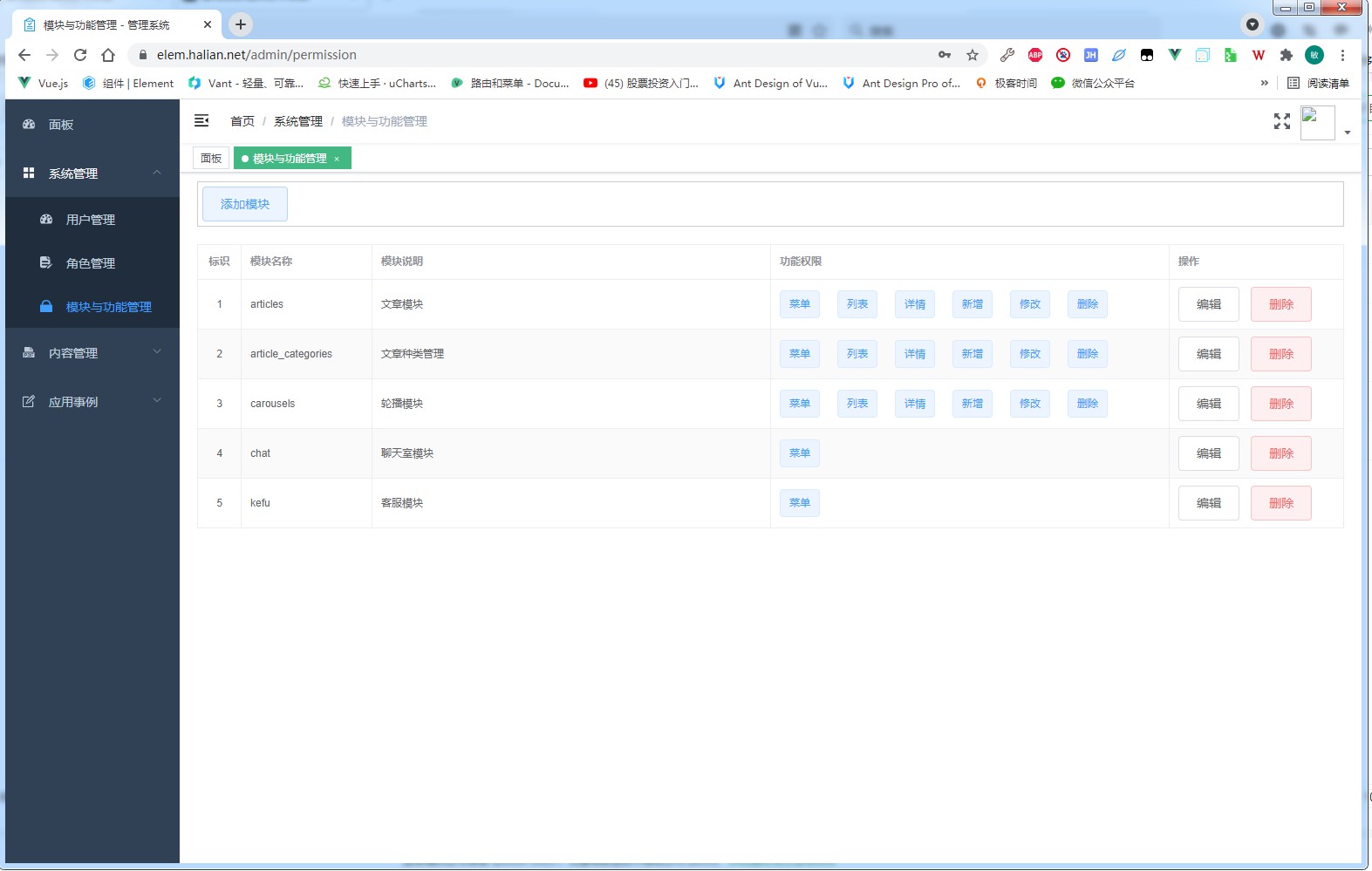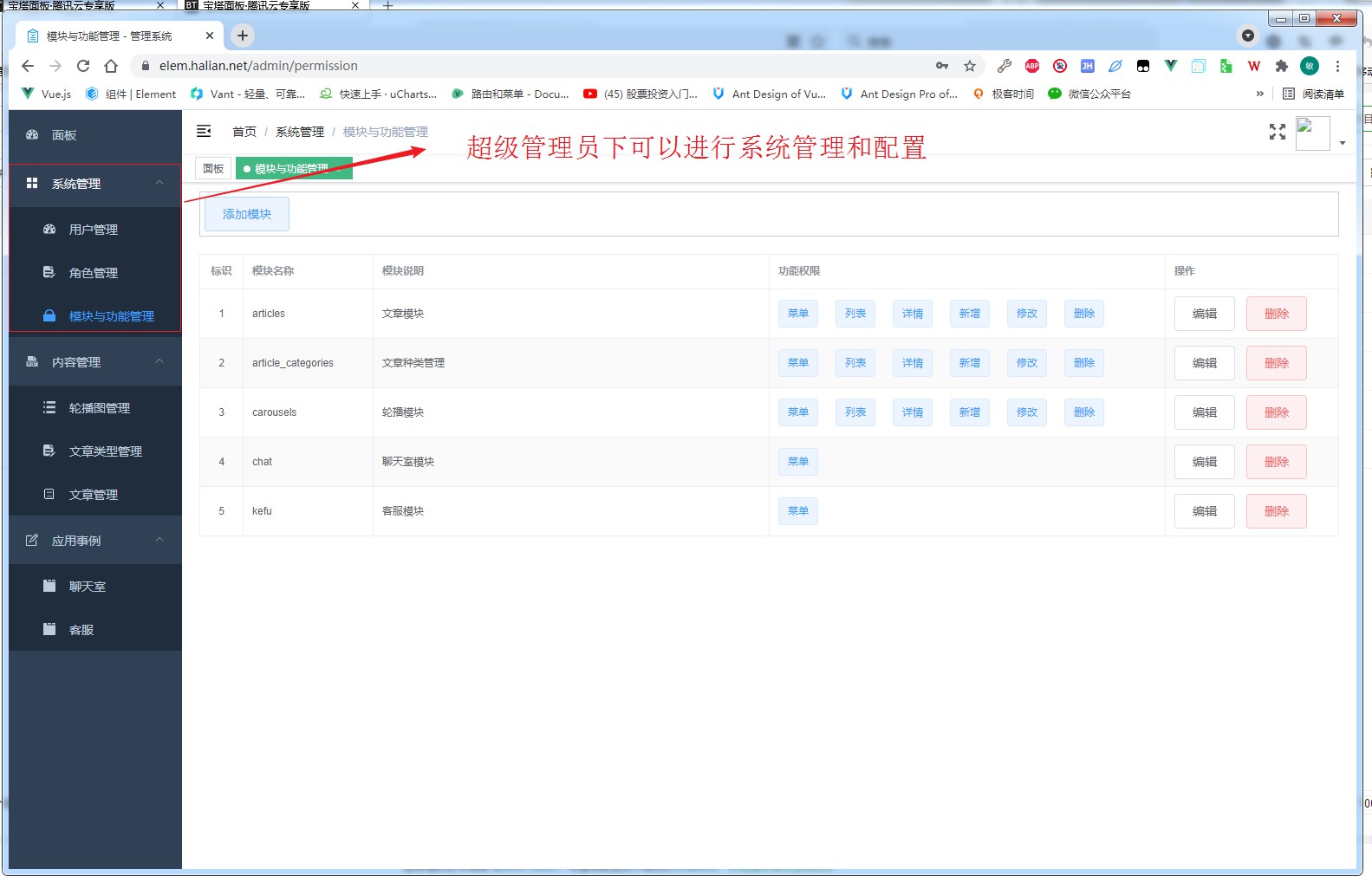 前端(element目录)负责页面的显示和前端用户权限的控制。项目引入了element UI框架,并已经对用户登录认证、路由、权限等基础功能进行了处理。前端用户的权限不但可以控制系统的导航菜单,而且可以控制到页面按钮、表格等内容的显示。使用者只需要专注于业务界面的开发即可。
