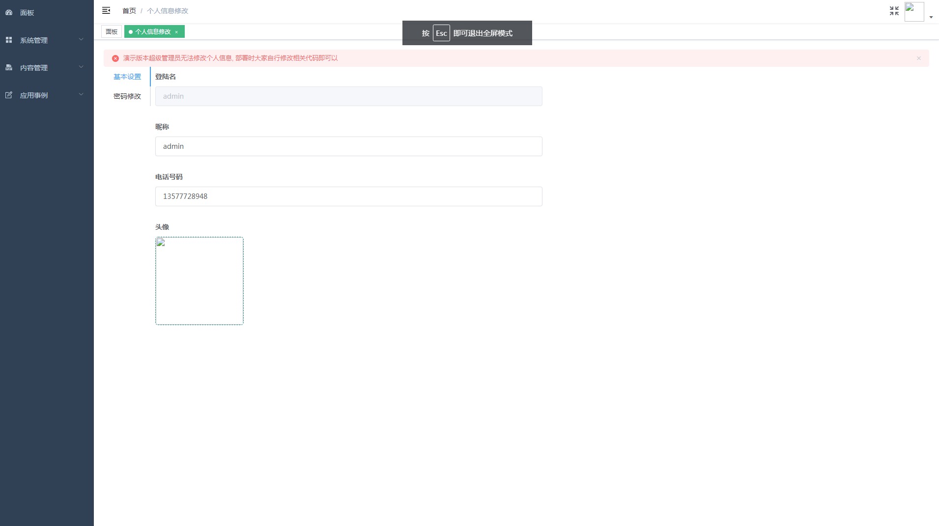 系统中admin用户为超级管理员,为了方便演示,也是为了供大家使用,发布的版本中,已经屏蔽admin用户的信息修改等功能,实际开发中,用户只需要去相应的前端页面中学校除去屏蔽修改的语句就可以。